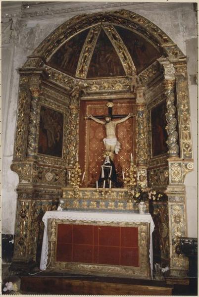 Ensemble du retable du Christ. Il comprend le retable à pans coupés, avec ses statues, Christ en croix et Vierge de Pitié ; cinq huiles sur toile, scènes de la Passion ; l'autel, les gradins et les lambris tripartites formant voûte.