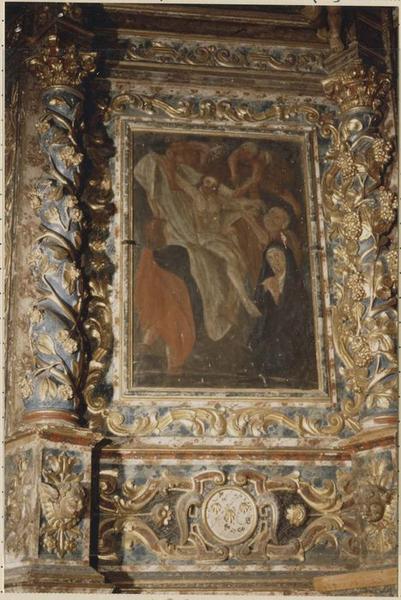 POP | Plateforme ouverte du patrimoineretable du Christ, 2 statues : Christ en croix, Vierge de Pitié, 5 tableaux : scènes de la Passion du Christ, autel, 2 gradins d'autel, lambris de hauteur