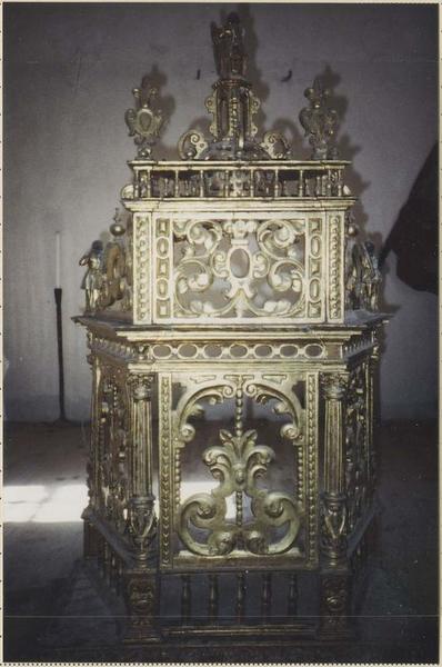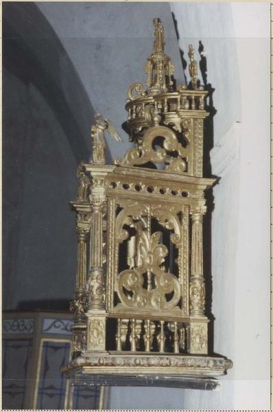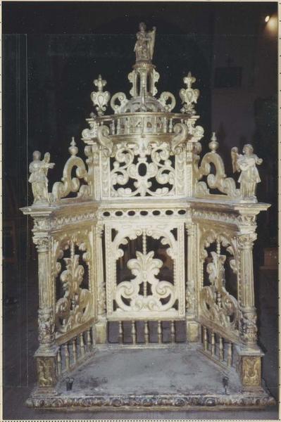 Chaise processionnelle triptyque à décor de lambrequins et de rinceaux. Dais à balustre couronné d'un David musicien. Anges musiciens surmontant les volets latéraux.