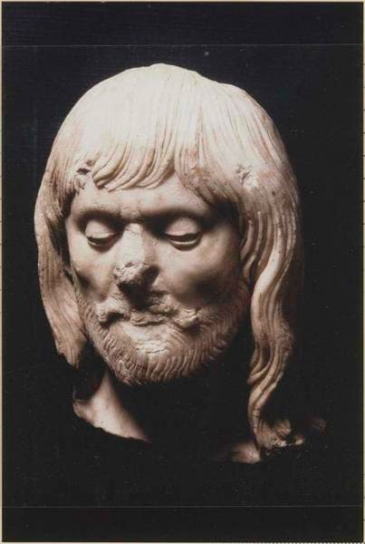 Tête d'homme aux yeux mi-clos, barbue, aux longs cheveux, appartenant à l'origine à une statue plus haute (troncature irrégulière au niveau du cou).