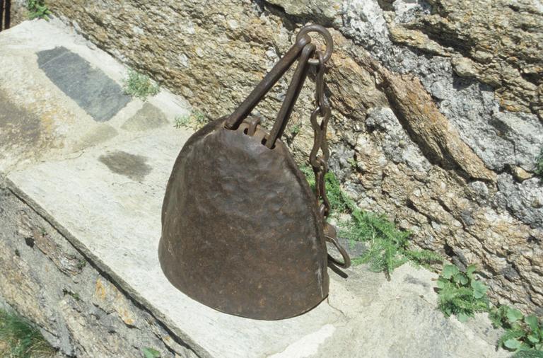 Cloche anépigraphe en fer forgé, battu formée de deux plaques de métal réunies par un rabattu. Plusieurs trous sont percés dans le cerveau de la cloche.