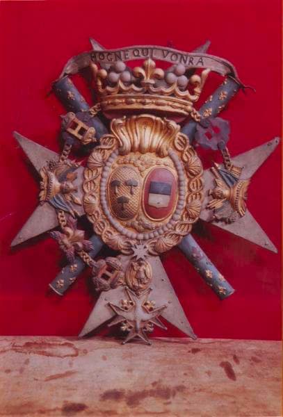 éléments d'une plaque commémorative : trois blasons au chiffre et aux armes du maréchal de Mailly, gouverneur du Roussillon, et de son épouse
