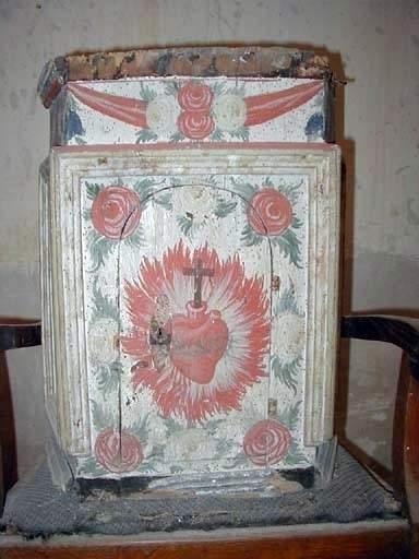 Décor de fleurs sur fond blanc assorti à l'escalier du reposoir. Intérieur du tabernacle peint en noir. Sur la porte : coeur enflammé du Christ surmonté d'une croix ; la représentation du coeur est très anatomique.