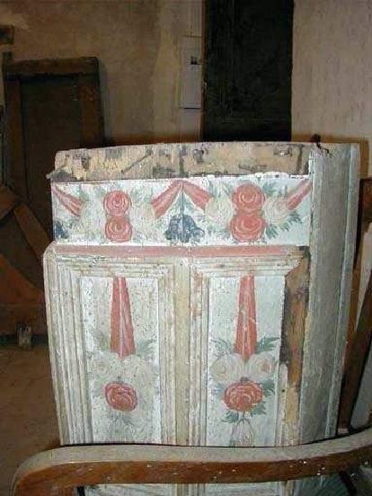 Il manque toute la moulure supérieure et une moulure inférieure. Attaque d'insectes xylophages très importante et généralisée. La surface est criblée des trous d'envol d'insectes xylophages. Les clous sont rouillés. Ensemble très sale et poussiéreux.