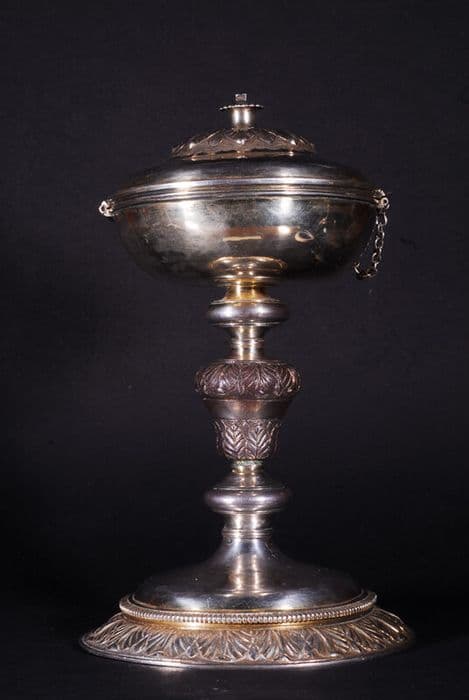 Ciboire pourvu d'un pied circulaire. La bordure est ornée d'un décor de feuilles. Une frise sépare la bordure et le dessus du pied légèrement bombé du ciboire. Le dessus du pied est lisse. Sous le pied nous trouvons trois poinçons (ville, date, maître). La tige est composée d'un noeud piriforme disposé entre deux collerettes. Le noeud est orné de feuilles. La coupe et le couvercle sont montés sur charnières. La coupe est lisse et porte en partie basse, près de la jonction avec la tige, trois poinçons. Le couvercle lisse est orné en partie sommitale d'un décor de feuille. Le bouton de préhension sommital devait accueillir une croix (aujourd'hui perdue).