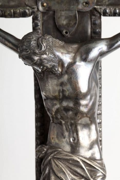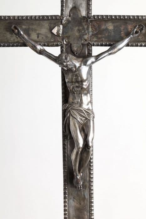 Croix latine à traverses rectilignes plates et lisses cernées en bordure d'un fin ruban d'oves séparées par de minuscules flèches. Les extrémités se terminent par des fleurs de lys fondues et rapportées. Sur la face, une figure du Christ montre un périzonium finement travaillé au mat. A la jonction de la croix, sur la face, mais également au revers, on a fixé à l'aide de clous, une fine plaque de métal découpée de festons en bordure. Au-dessus de la tête du Christ, le titulus aux formes chantournées et à décor de têtes d'angelots porte l'inscription INRI. La base de la traverse inférieure de la croix est gainée de grandes feuilles d'acanthe et prend assise sur une terrasse ornée en bordure d'un cordon d'oves. Elle se termine par un pas de vis, qui permet de fixer la croix sur la lanterne. Techniquement, la croix se compose d'une âme de bois, sur laquelle on a cloué des plaques d'argent, les fixations sont faites à froid, avec des pointes, des vis et des écrous. La lanterne se compose de deux éléments, la douille cylindrique à moulures, et le pommeau pririforme, dont le corps renflé possède un décor de médaillons chantournés habité de motifs floraux, liés entre eux de guirlandes de feuilles. La base et l'étranglement portent un décor d'oves et de godrons, tandis que le col arbore une frise d'oves. Un pas de vis placé à l'intérieur permet la fixation de la croix.