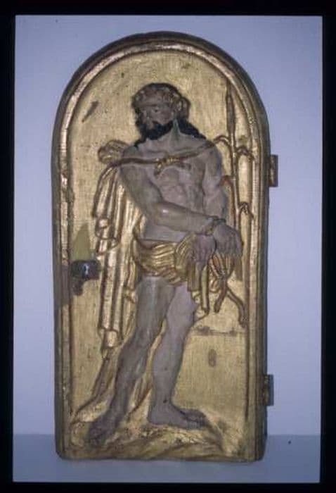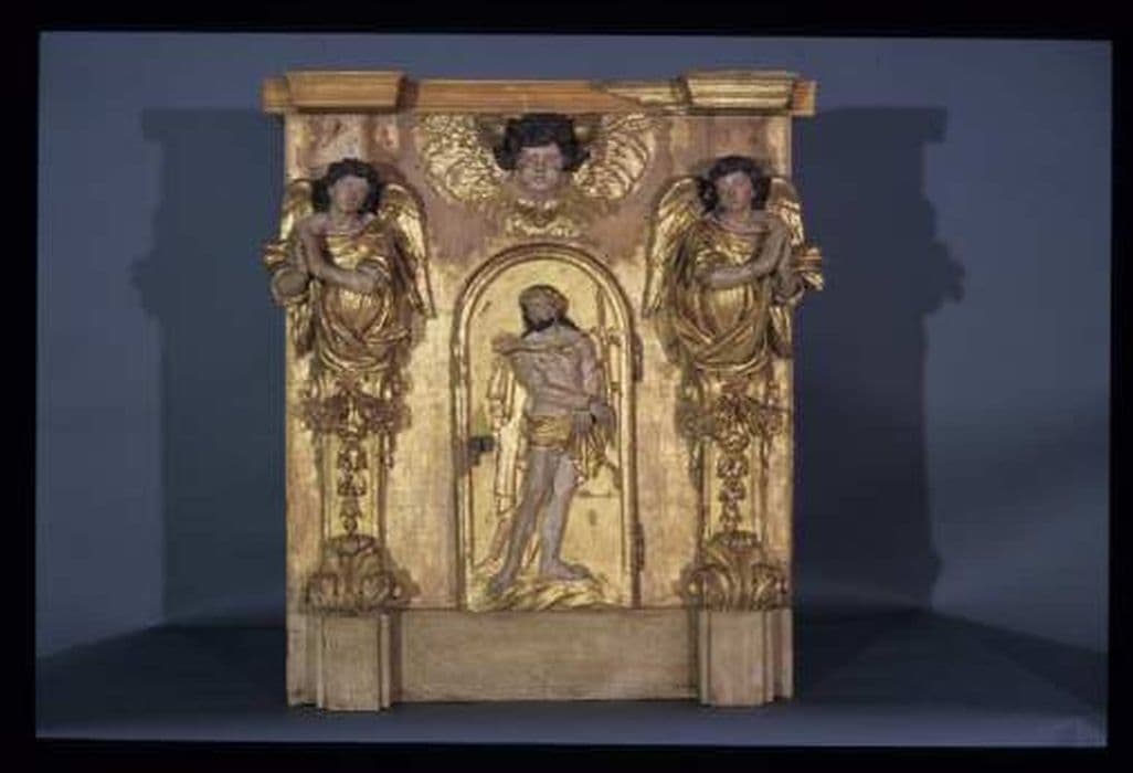 Le tabernacle est composé d'une simple caisse en bois peint, ayant la forme d'un parallélépipède sur laquelle divers éléments en bois sculpté et doré sont rapportés. Une porte au milieu du tabernacle permet d'avoir accès à l'intérieur. Un christ aux liens présenté de face et portant un roseau y est figuré. De part et d'autre de cette porte se trouvent deux Hermès ailés en prière. Une tête d'angelot est placée au-dessus de la porte ; une moulure couronne le tabernacle, elle ne se prolonge pas sur les côtés. Support : On se trouve en présence d'une remarquable sculpture tandis que la caisse est d'une qualité médiocre ; elle n'est sans doute pas d'origine. La caisse est principalement constituée par des planches de pin d'une épaisseur allant de 15 mm à 20 mm ; tous les éléments d'origine (la porte, les planches verticales de la façade, les éléments sculptés ainsi que la moulure sommitale) sont en peuplier. Les planches sont assemblées entre elles par languette et rainure ou simple collage renforcé par des clous. Les éléments rapportés (tête d'angelot, liernes, moulure) sont collés (colle animale) et cloués. Les Hermès ainsi que la tête d'angelot sont composés de plusieurs pièces assemblées entre elles par collage (colle animale). La porte est maintenue par deux paumelles d'origine. De nombreux clous et petits crochets à l'intérieur servaient à fixer un tissu (au moment de la réception se trouvait encore un tissu déchiré couvrant le fond de la caisse et un petit rideau également déchiré à l'intérieur du tabernacle). Il manque un couronnement en haut du tabernacle, une mortaise dans la tête de l'angelot central laisse supposer que celle-ci servait autrefois de console. Polychromie : La caisse du tabernacle est recouverte d'une fine couche de peinture gris clair posée grossièrement (trace de coup de pinceau un peu partout) ; elle est appliquée soit directement sur le bois des parties refaites, soit elle couvre les deux dorures successives des planches verticales de la façade, précédemment recouvertes d'une couche épaisse de préparation blanche. Le revers de la caisse est couvert d'un badigeon blanc très lacunaire, au fond à l'intérieur est peinte une colonne en beige et ocre jaune (peinture naïve, correspondant à un joint du 19e siècle) ; le revers de la porte est peint en bleu avec des étoiles couleur or. La porte et les éléments sculptés portent plusieurs couches de polychromie successives : les carnations ont été repeintes trois fois : a. original : préparation blanche épaisse, encollage, couche assez épaisse d'un rose soutenu, aspect lisse. b. 1. Repeint : préparation blanche, couche d'un rose foncé. c. 2. Repeint : couche beige avec des rehauts rouges. d. 3. Repeint : couche rose avec des rehauts roses foncés en fine épaisseur, la dorure est constituée d'un original recouvert par une deuxième couche de dorure et localement par une bronzine posée grossièrement ; une fine couche blanchâtre, légèrement opaque, ressemblant à du blanc d'oeuf couvre les parties inférieures de deux Hermès. a. original : préparation blanche, assiette rouge, dorure acqueuse, polie. b. 2 ème dorure : préparation blanche, assiette rouge, dorure acqueuse plie, suivie d'une couche de vernis jaune. c. intervention suivante : application d'une couche épaisse de bronzine sur l'ensemble de la dorure ; on observe très localement une couche bleue située au-dessus de la première dorure, peut-être est-elle un vestige d'un ancien estofado disparu ?