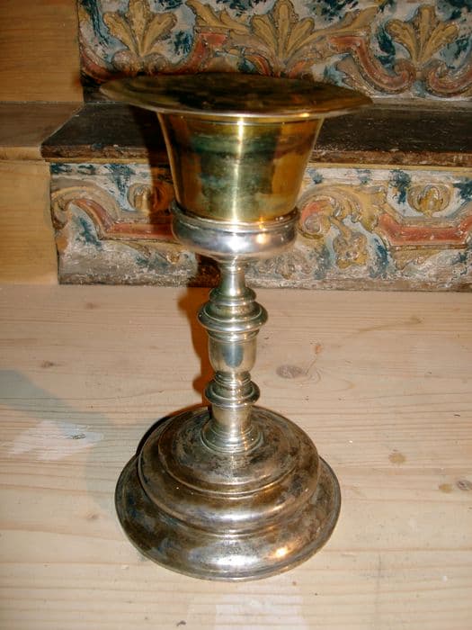 Calice avec pied circulaire à degrés ; tige balustre ; noeud en forme de vase ; fausse-coupe basse et renflée, lisse de tout décor, coupe évasée lisse et dorée à l'intérieur comme à l'extérieur. La patène est lisse et ne présente aucun décor ; elle est dorée sur sa face interne et sur son rebord extérieur.