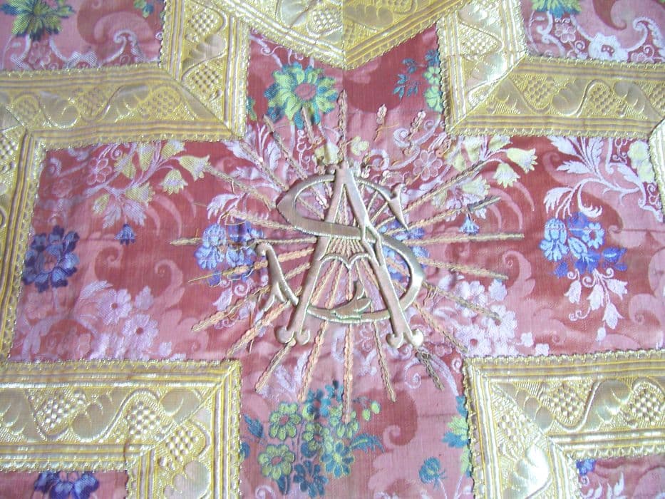 Meuble de gauche, chasublier de gauche (5e plateau) : Chasuble : damas de soie rose (fond satin motifs taffetas) façonné, plusieurs lats de soie polychrome (volutes et fleurs). Orfroi, même fond avec broderie d'applique en relief : filés, canetilles et paillettes or, représentant les initiales SA entrelacées. Large galon filé or soie jaune (demi-ailes d'anges, grappes de raisins), plus étroit en bordure. Doublure satin de coton rouge calandré. Colletin à bord rebrodé. Franges torsades dorées. Voile de calice : doublure de sergé rouge aspect soyeux. Meuble de droite (2e tiroir du milieu) : Etole rose : fond damas de soie rose (fond taffetas motifs satin) façonné, plusieurs lats de soie polychrome, représentant des motifs fleuris. Croix broderie d'applique en relief avec filés, canetilles et paillettes or. Galon filé or soie jaune (demi-ailes d'anges, grappes de raisin). Franges torsades dorées. Doublure satin de coton rouge. Colletin à bord dentelle. Ensemble complet (la bourse, dernier élément manquant était tombé derrière le meuble).