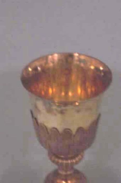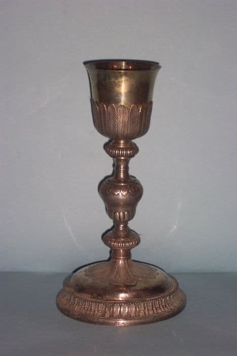 Argent : repoussé, amati, gravé ; argent : doré (patène). Calice composé d'un pied de forme circulaire et bombé, orné d'un décor de perles alternées de godrons sur la bâte. La tige s'orne d'un noeud ovoïde à décor de palmettes et de besons aux extrêmités, la partie intermédiaire restant lisse. Il est encadré de deux collerettes à godrons. La coupe est insérée dans une fausse coupe ornée de feuilles de type palmettes gravées et amaties. L'ensemble du calice est en argent ; l'intérieur de la coupe est doré. Le décor du calice comportait peut-être à l'origine des parties réservées argent sur fond doré (aujourd'hui usé). La patène est entièrement dorée et de forme plate sans ressaut en argent doré. Elle comporte une représentation de l'Agneau de Dieu avec bannière et croix, entourée d'un ruban à festons lâches.