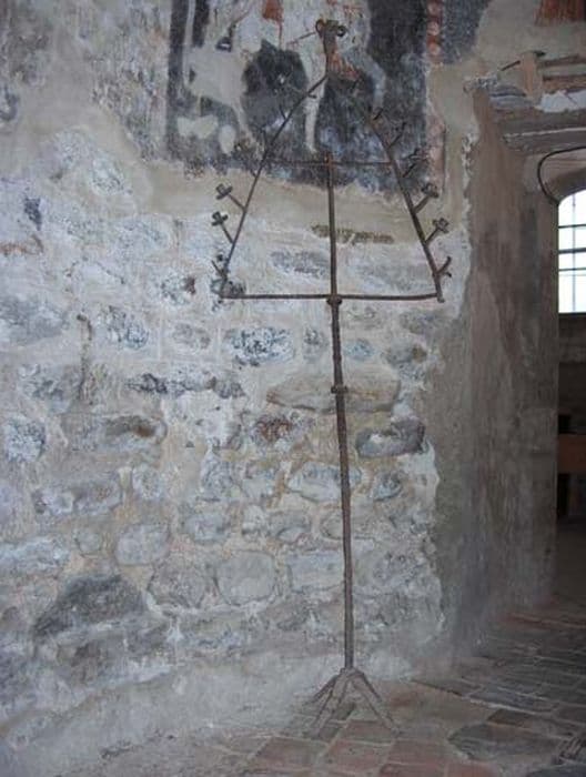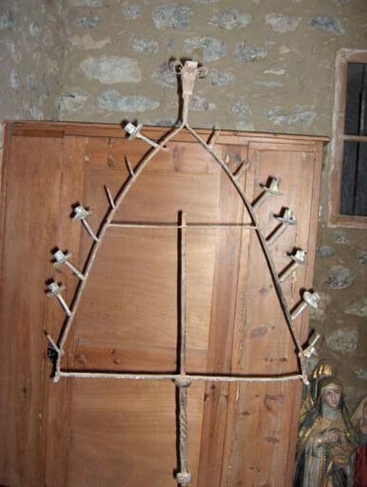 Chandelier des Ténèbres de forme triangulaire avec un long pied en fer forgé muni, sur le triangle, de 15 supports où se trouvaient les cierges. Au sommet, était apposé le cierge pascal pendant la Semaine Sainte.