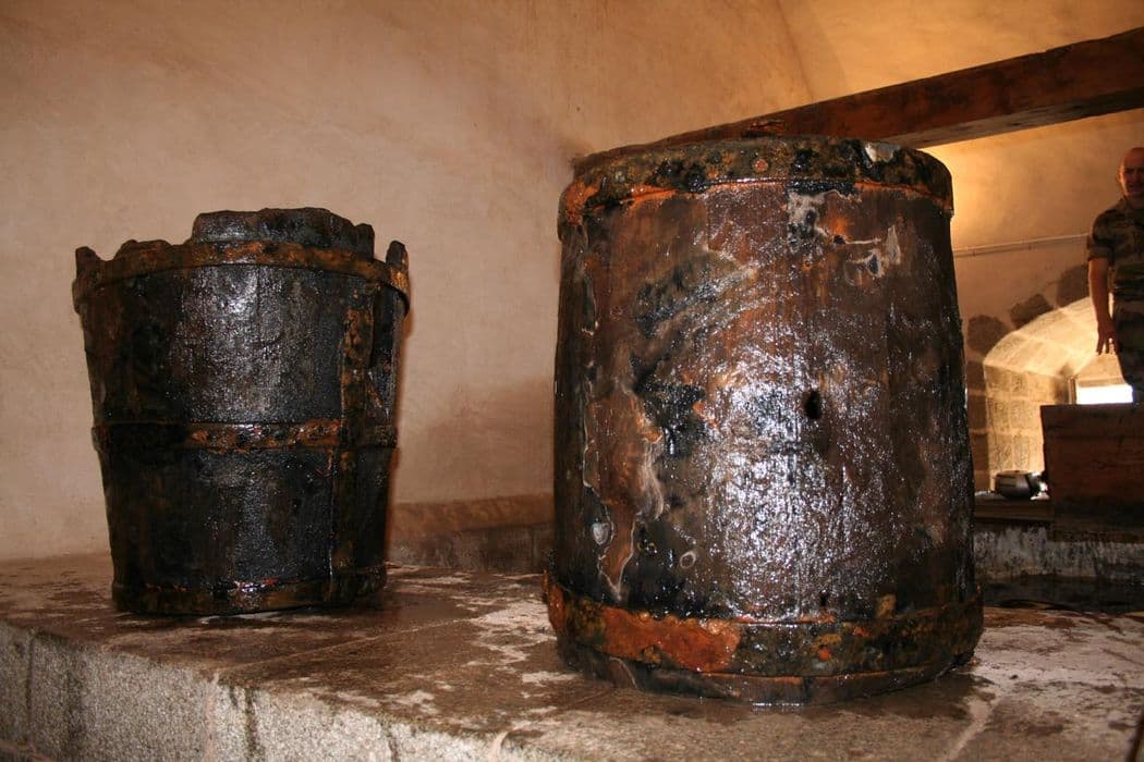 Seaux en bois à eau avec cerclages en fer, renfort latéral, encoches, de formes tronconique et de barrique. Deux de ces seaux datent probablement du XVIIe siècle et appartiennent à deux modèles différents : l'un est de modèle tronconique, l'autre en forme de barrique. Le seau tronconique a une hauteur de 65 cm, un diamètre en partie basse de 49 cm, en partie haute de 64 cm. L'épaisseur des douelles, en bois de châtaignier, est de 4 cm. Poids : une trentaine de kilos. Il est rigidifié par trois cerclages en fer avec un renfort latéral. La poignée de renversement a disparu. Ce seau montre une contenance de 80 litres. Le second seau adopte la forme d'une petite barrique : sa hauteur est de 65 cm. diamètre : 55 cm. Epaisseur des douelles (châtaignier) : 4 cm. Il est rigidifié par trois cerclages de fer, l'un d'entre eux ayant disparu. La partie haute comporte des encoches qui sont les traces de la poignée de renversement. Les deux seaux du XIXe siècle sont identiques. Ils sont en châtaignier et mesurent 65 cm de diamètre en partie haute, 42 cm en partie basse, 53 cm de haut. Poids : 40 kilos avec leurs cerclages de fer et la poignée de renversement qui, là, a survécu de même que 25 mètres de chaîne. Contenance : 103 litres.