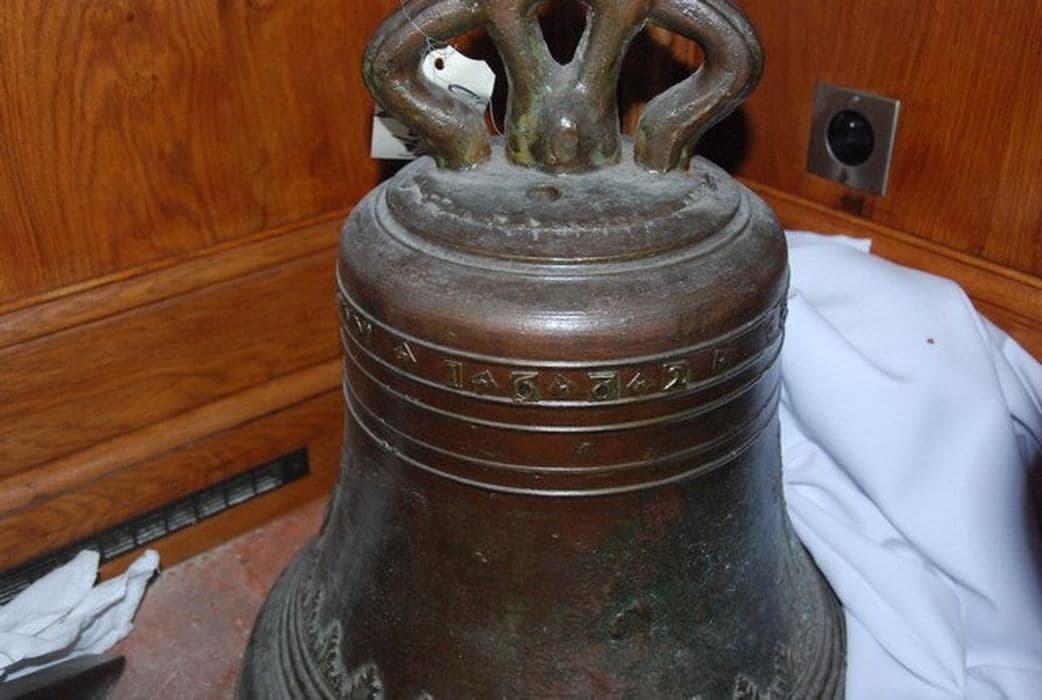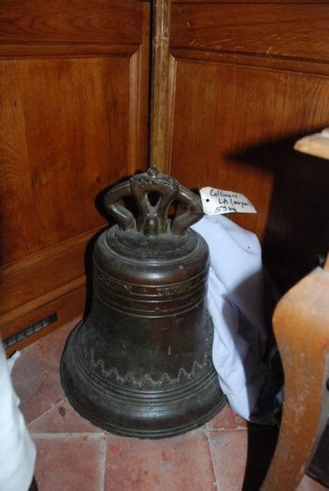 Une anse à trois trous. Nombreux entrefilets au cerveau, au bas de la panse et à la pince avec une frise annulaire à palmettes. Une croix d’ornementation à un degré avec les initiales du fondeur VB ou UV. Note : la 4.