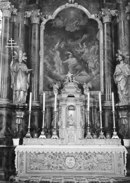 autel, gradin, tabernacle, retable, tableau : saint Cyriaque guérissant la fille de l'empereur Dioclétien, 3 statues : Vierge à l'Enfant, saint Grégoire le Grand, saint Barthélémy apôtre (maître-autel)