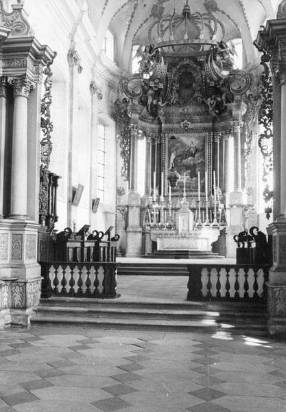 autel, retable, 3 tableaux : Notre-Dame du Mont Carmel remettant au bienheureux Simon stock le scapulaire, Adoration des Mages, Apothéose de saint Maurice (maître-autel dit de saint Maurice)