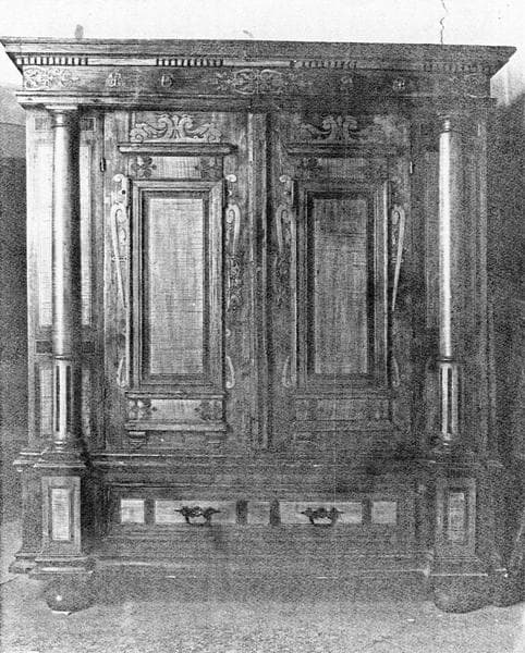 Sapin (bâti), hêtre, noyer, bouleau, érable, etc (incrustations et applications). Pieds en boules supportant un socle à deux tiroirs à poignées articulées. Façade à deux colonnes toscanes. Deux battants à fenêtres à fronton surmonté d'un ornement découpé en volutes symétriques et accosté d'ailerons découpés et appliqués. Entablement : corniche à quatre groupes de denticules, frise à trois motifs de ferronnerie.