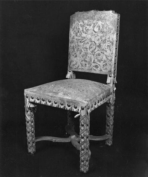 Série de 12 chaises à dossiers bas. Pieds et montants carrés habillés de lanières de cuir croisées et cloutées. Garniture de cuir de Cordoue à entrelacs végétaux. Sur le dossier, agencé en forme d'accolade très aplatie, écu de Hohenzollern entre deux hallebardiers. Entretoises croisées en X.
