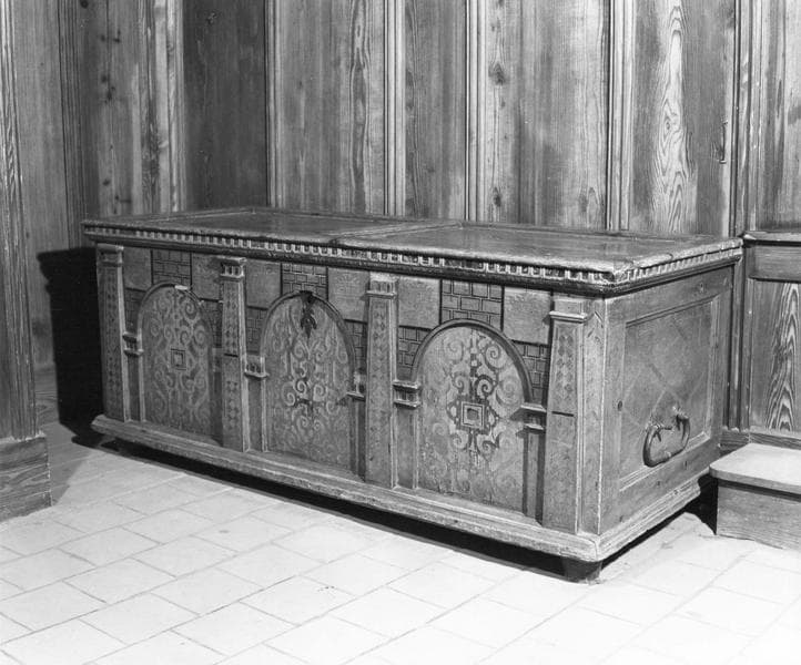 Façades à trois arcades cintrées sur fond de faux appareil, encadrées de pilastres galbés décorés de damiers. Champs décorés de motifs en ferronnerie. Faces latérales : panneau quadrillé, poignée articulée. Ceinture basse moulurée. Couvercle à deux panneaux et entourage de faux denticules.