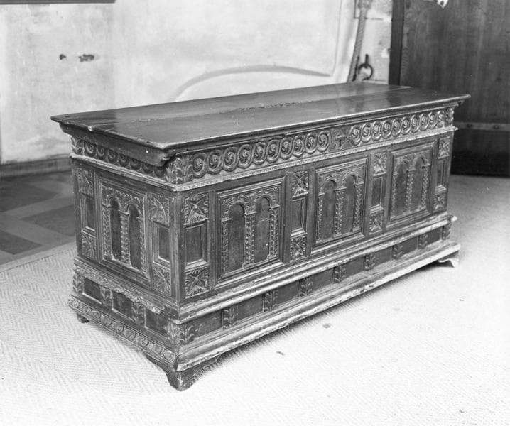 Ceinture basse en sapin. Décor à quatre étages sur trois faces, frise supérieure : chaîne sans fin et palmettes d'angles, registre médian : 4 panneaux étroits ornés d'un cadre lisse entre deux étoiles à quatre branches alternant avec 3 panneaux carrés, frise inférieure : palmettes. Ceinture basse moulurée à rosettes sur le côté gauche.