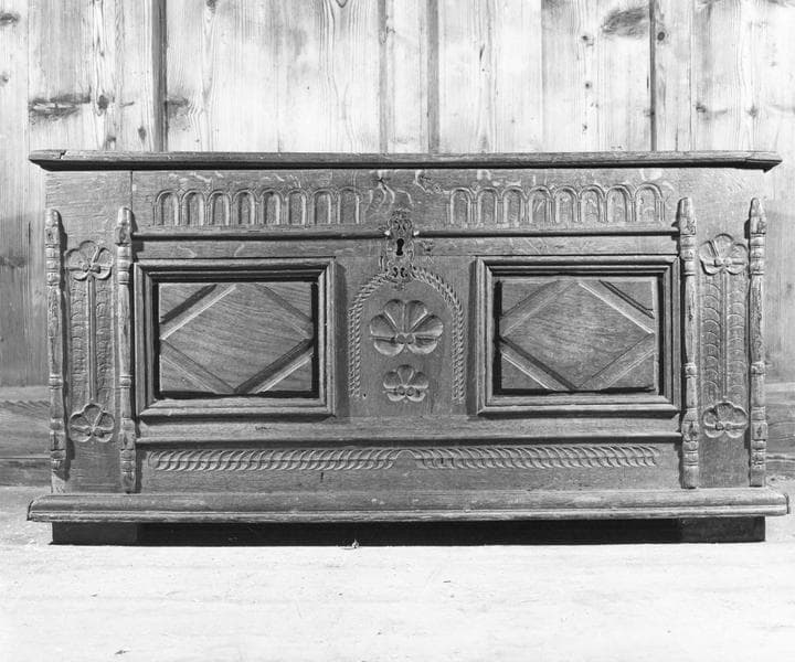 Couvercle à bords en doucine. Façade à trois registres, supérieur : arcature cintrée, médian : 2 panneaux à moulures et motifs en losange, inférieur : câbles de sens opposé. Ceinture basse moulurée. Plaque d'entrée de serrure.