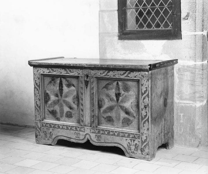Polychromie bleu et rouge. Façade divisée en 2 panneaux ornés de motifs rayonnants entourés de cadres moulurés. Montants et traverse supérieure décorés de feuillages et sculptés en méplat. Traverse inférieure découpée en accolade.