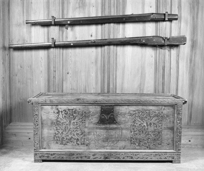 Façade : cadre mouluré à plate-bande de feuillages en bas et sur les côtés. Grand panneau à 3 motifs sculptés. Couvercle à cadre mouluré et face guillochée.
