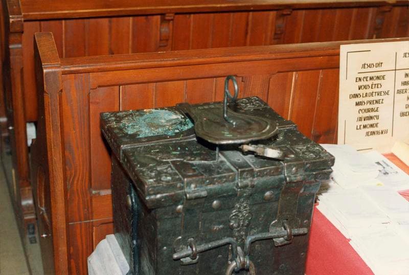 Le tronc comporte 2 parties : un socle en grès, daté 1717 sur sa face antérieure et scellé dessus, le tronc proprement dit, peut être plus ancien. Le socle a ses 3 faces sculptées de panneaux en réserve : sur la face antérieure, un losange debout formant pointe de diamant ; sur les côtés, un motif rectangulaire légèrement concave. La moulure supérieure s'accorde aux dimensions du tronc ; ce dernier est réalisé en bois bardé de plaques de métal rivetées de charnières et de motifs décoratifs.