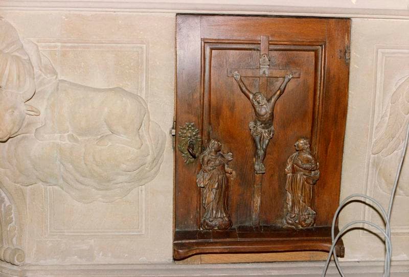 Grès de couleur jaune et grise. Table de plan rectangulaire arrondi aux angles et formant un parallélépipède régulier. Les 4 angles sont sculptés d'atlantes engainés. Trois côtés sont sculptés de bas-reliefs. Au centre de la face postérieure s'ouvre une porte en bois sculptée.