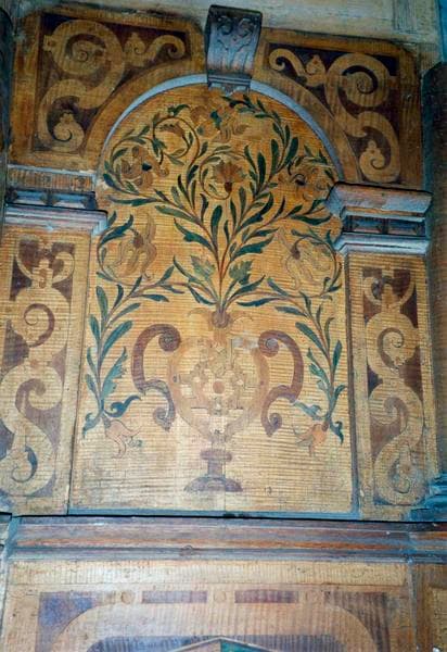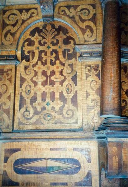 La cuve de plan octogonal est un beau spécimen de menuiserie Renaissance. Chacune de ses 5 faces est séparée des autres par une colonnette reposant sur une haute base (5 en tout, la 6e manque). Sur chaque panneau figure un arc en plein-cintre de structure architectonique.