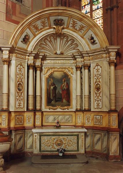 Tableau daté 1896 et signé Heinrich Kaiser. Le tableau n'est pas le tableau d'origine du retable. Signé Heinrich Kiaser et daté 1896. Sigrist (tome II, p. 177) nous dit 'qu'en 1729, l'abbé Moser plaça dans l'église six autels neufs, fit dorer le maître-autel..'. Plus loin, (p. 205), il ajouta que les autels latéraux 'sont au nombre de quatre et du même style que le maître-autel, ils sont d'une valeur artistique et occupent les angles du transept'. La parenté stylistique de l'autel des saints-Auteur-et-Céleste avec l'autel Saint-Laurent de la cathédrale de Strasbourg (vers 1698) aurait incité à une datation un peu plus précoce.