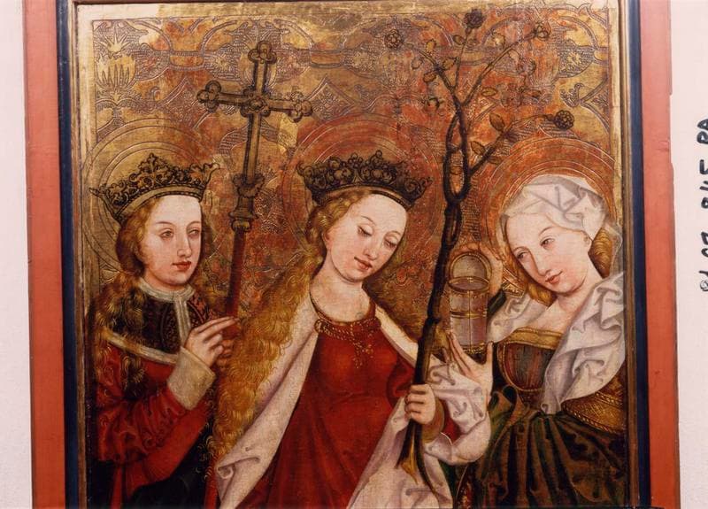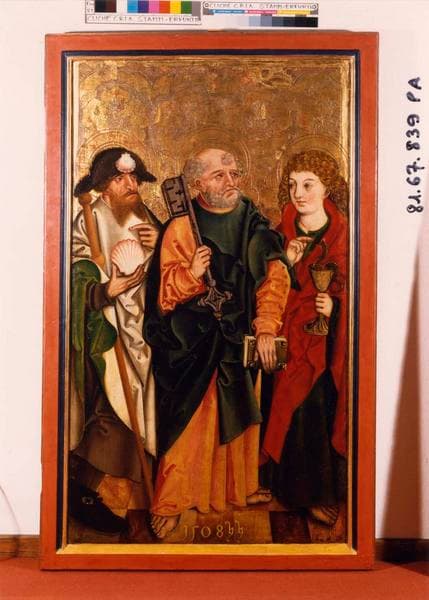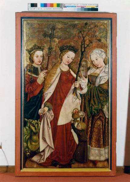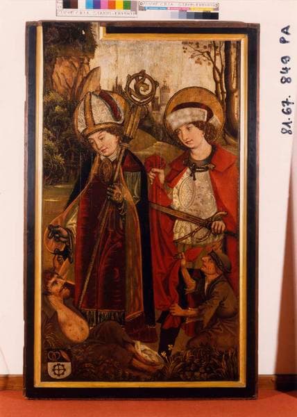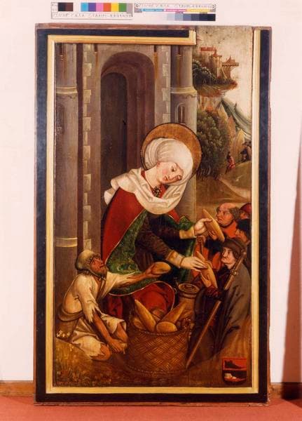 2 volets de polyptyque : Saint Jacques le Majeur, Saint Pierre et saint Jean l'Evangéliste, Sainte Elisabeth de Hongrie, Sainte Marguerite, sainte Dorothée et sainte Claire, Un Evêque et saint Martin