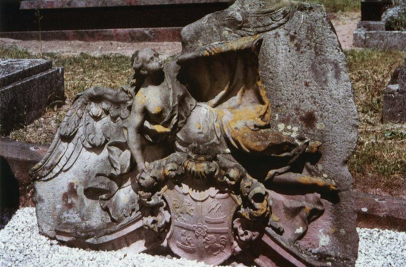 Huit fragments. L'épitaphe du baron a été reconstituée. L'ensemble du monument reposait sur une console rocaille.