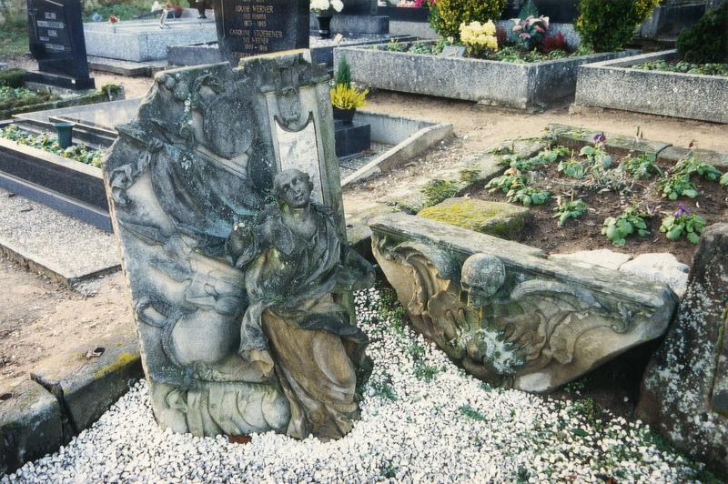 Avant déchouer au cimetière, le monument funéraire de baron Louis de Sinclair (1680-1738) était encastré dans l'église d'Oberbonrn où il est à nouveau en place après avoir été restauré. Il y avait été enlevé sous la Révolution (1793), avec d'autres monuments nobiliaires et déposé dans un endroit inconnu. On pense que l'installation au cimetière remonte aux alentours de 1885, après l'enterrement du dernier Strahlenheim. Les Strahlenheim sont un famille d'origine suédoise, anoblie au milieu du 17e siècle, et qui apparaît en Alsace à partir de 1716, lorsque Henning de Strahlenheim achète la seigneurie d'Oberbronn aux Linange-Westerbourg. Après 1751, les Strahlenheim cèdent la place aux successeurs par alliance des Linange-Westerbourg : les Hohenlohe-Bartenstein, les Loewenhaupt et les Sinclair. Louis, baron de Sinclair né à Stockholm et issu d'une importante famille noble suédoise, était conseiller du roi de Pologne, Stanislas Ier. En 1711, il épouse Esther-Juliane de Linange - Westerbourg qui lui lègue à sa mort (1729) sa part du bailliage de Niederbronn et la moitié de sa part d'Oberbronn. En 1732, Sinclair épouse Madeleine Sophie, comtesse de Loewenhaupt. Il meurt à Strasbourg le 9 août 1738. Son monument funéraire a été conçu dans un goût baroque très monumental dont on rencontre peu d'exemples dans la région. La dernière Strahlenheim avait épousé un fils du fameux horloger Schwilgué ; après son décès, elle a laissé des biens à la paroisse protestante d'Oberbronn, à charge pour celle-ci d'entretenir les monuments funéraires de sa famille.