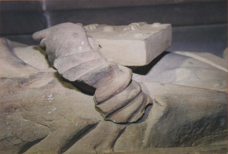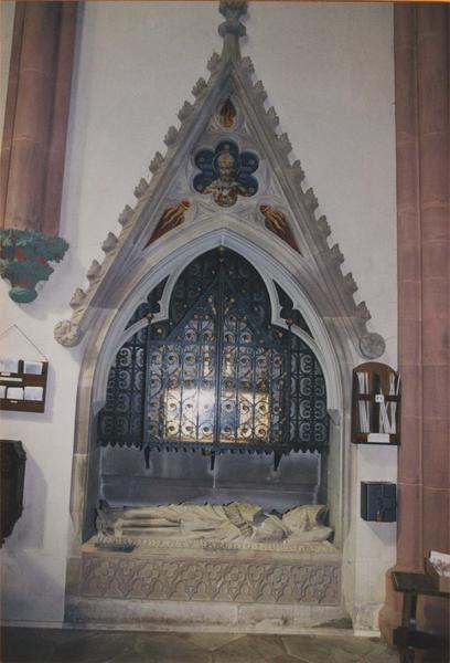 Le gisant présentait déjà des parties abîmées au 19e siècle : le dessus de la crosse d'évêque notamment est une restauration par Boeswillwald.