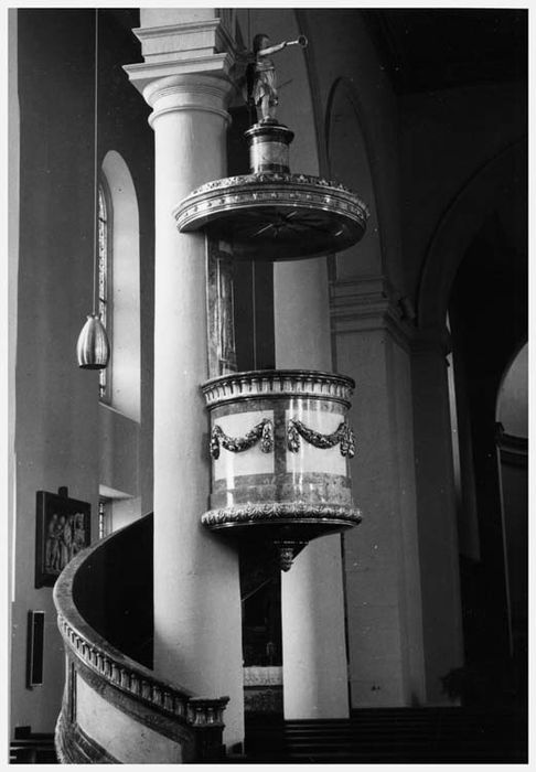 Chaire en bois peint en faux marbre de tons clairs. L'escalier d'accès contourne le pilier auquel est fixée la cuve circulaire. Cuve ornée de guirlandes, surmontée d'un abat-voix, lui-même surmonté d'un ange sonnant de la trompette.