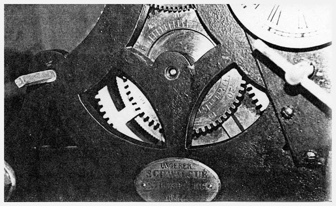 Sur le bâti antérieur de l'horloge, une plaque en laiton précise : EXECUTE SOUS LES ADMINISTRATIONS/DE MR JOST ET CLAUSS/MAIRES DE BISCHOFSHEIM. Sur l'horloge elle-même, un écu ovale en laiton porte l'inscription d'origine : SCHWILGUE STRASBOURG 1844 à laquelle on a rajouté : UNGERER 1922.