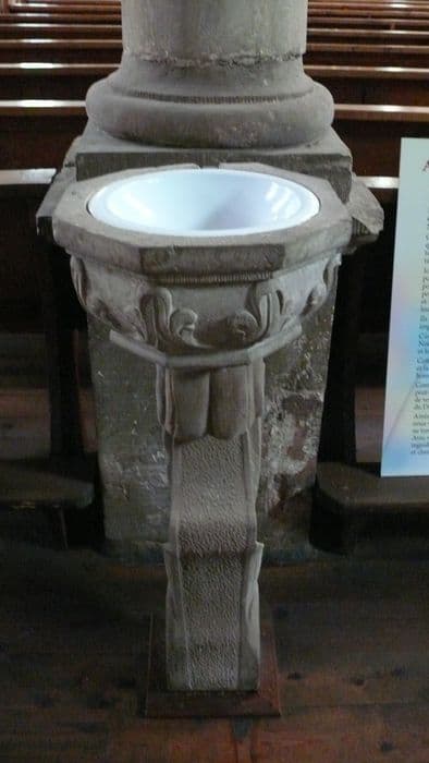 Bénitiers réalisés dans un grès gris. Le pied est une grande volute. La cuve, octogonale, est sculptée de feuilles évoquant des fleurs de lys stylisées.