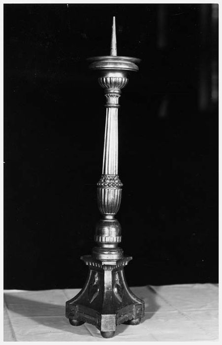 Les chandeliers, en bois, ont une tige cannelée. Les pieds, à bases triangulaires, sont ornés de coeurs ardents sur chacune des trois faces. Les croix d'autels ont le même pied. Le christ et la croix sont en métal.