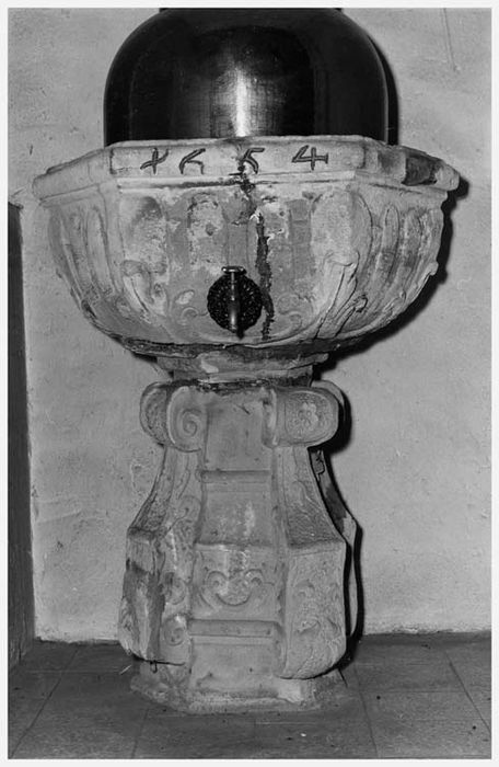 Ces fonts baptismaux proviennent de l'édifice antérieur. Ils ont été placés à l'extérieur de l'église pendant un certain temps puis mis à l'abri dans l'église. Le couvercle, en cuivre, est moderne. Le robinet de laiton également.