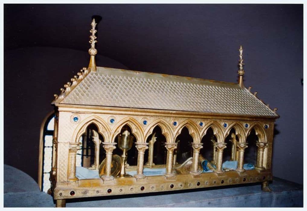 Châsse de style néo-gothique, en forme de maison, sur quatre pattes de lions. Elle s'ouvre sur un de ses grands côtés par une arcature de sept arcs brisés trilobés plus un arc sur le petit côté. Le toit, à quatre versants, simule des tuiles et s'orne de pinacles, fleurons et faîte ajourés. A l'intérieur, les reliques sont visibles dans un réceptacle ajouré de quadrilobes vitrés.