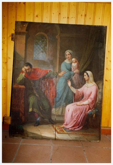 Sur le panneau n°1 (Naissance de Sainte Odile) : signature suivie de la date 1855.