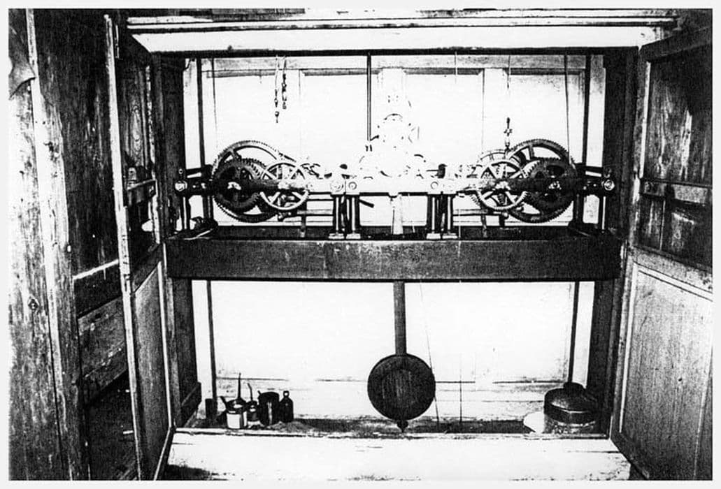 L'horloge se compose de deux bâtis parrallélépipédiques en fonte disposés de part et d'autre d'une structure centrale plus élevée à base de courbes et contrecourbes : le mouvement, formé de l'horloge et du pendule ainsi qu'un échappement au sommet. Le style de Schwilgué se reconnaît à l'emploi de colonnettes doriques pour le bâti. La structure est ici pyramidante à volutes, ce qui devient un modèle de production courante jusqu'au milieu du 20e siècle.
