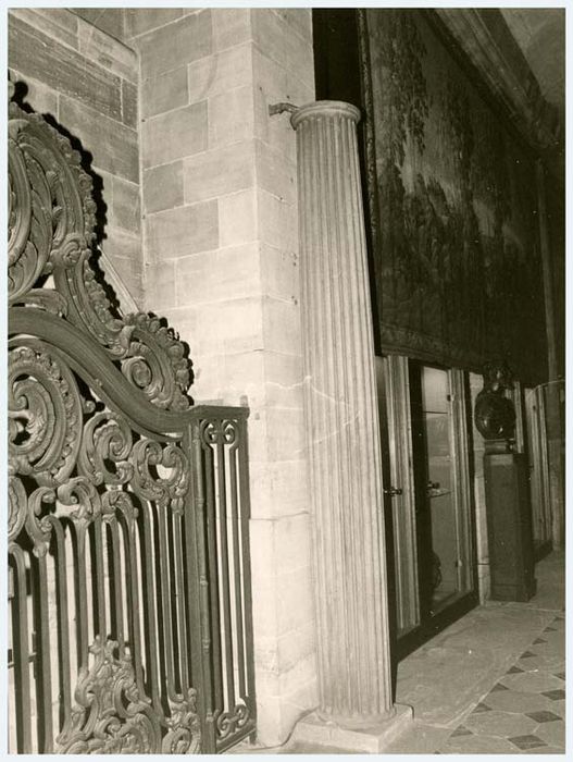 Colonnes provenant du maître-autel à baldaquin de Martin Frémery, réalisé entre 1682 et 1686. Elles étaient alors pourvues de bases et de chapiteaux métalliques. Récupérées lors de la destruction de l'autel suite à un incendie en 1759, elles furent réutilisées par Joseph Massol pour les deux trônes de l'évêque et de l'officiant à la fin du 18e siècle. Les socles ont été rapportés ultérieurement.