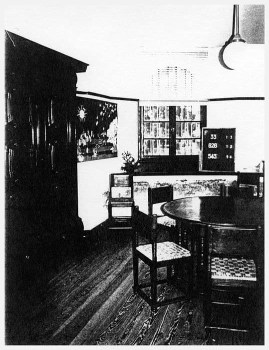Chaises à quatre pieds droits reliés par des traverses, dont les prolongements sont annelés, et à dossiers droits. La table, dont le plateau est rond, possède huit pieds annelés.