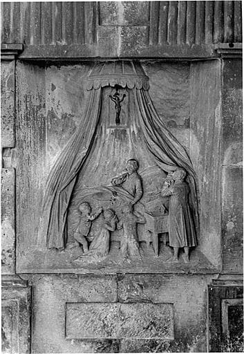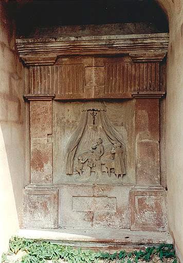 Edicule de facture néo-classique en grès rose et gris, avec un décor en bas-relief.
