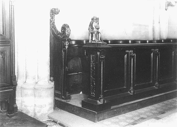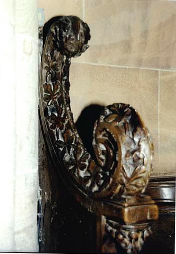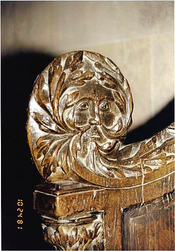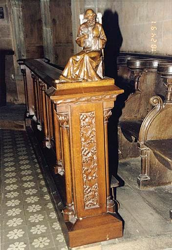 Deux séries de cinq stalles, l'une au Nord et l'autre au Sud et une série de quatre stalles au Nord-Est. Les parcloses comportent de petites colonnettes sous les sièges et sous les accotoirs. Des volutes soulignent les parcloses. On n'observe aucun décor figuré sur les miséricordes, toutes semblables. A l'Ouest des stalles subsistantes les jouées sont couronnées par une épaisse volute sculptée de feuilles de marronnier ou de lierre. L'enroulement inférieur de la volute Sud se termine par une tête humaine ceinte de feuilles d'acanthe.