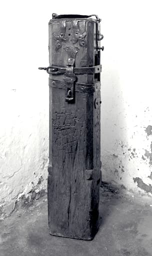 Tronc de section carrée, biseauté sur ses angles antérieurs. Il comporte, intacts, ses deux systèmes de fermeture en fer forgé. Le couvercle de l'orifice supérieur, qui s'actionne par un levier, est maintenu par des bandes en fer forgé terminées en fleur de lys. L'orifice de récupération de la monnaie se situe en façade antérieure.