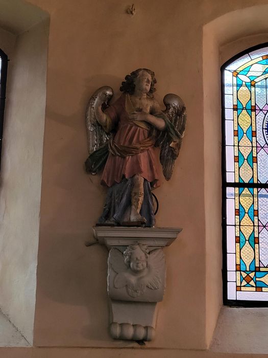 Ces statues doivent provenir du maître-autel et devaient former un ensemble avec les deux autres anges portant posés sur la clôture du choeur.