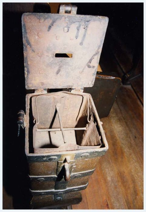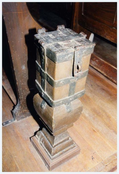 Tronc en forme de caissette cerclée de fer, avec ouvertures sur le dessus. Il est fixé sur un demi-balustre au pied mouluré, de section carrée.