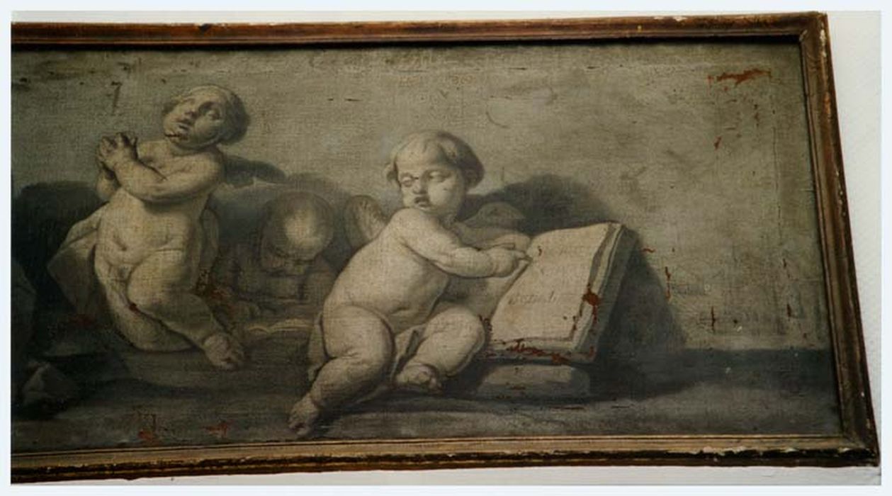 Toiles peintes en grisaille représentant, l'une, des putti avec un livre et l'abbaye au fond, et, l'autre, trois putti avec les attributs de l'abbé et une ruche évoquant la devise des bénédictins : ora et AL